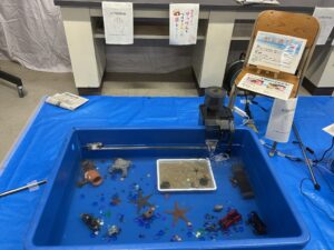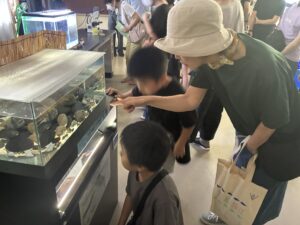 当日の展示では、オオミミズハゼ・マツカサウオ・アブラハヤ(コイ科)、ふれあい用のヤドカリ・ヒトデ・ヌカエビなどを紹介しました。2日間で約500人の来場者となり、多くの方々に見ていただき、喜んでいただくことができました。