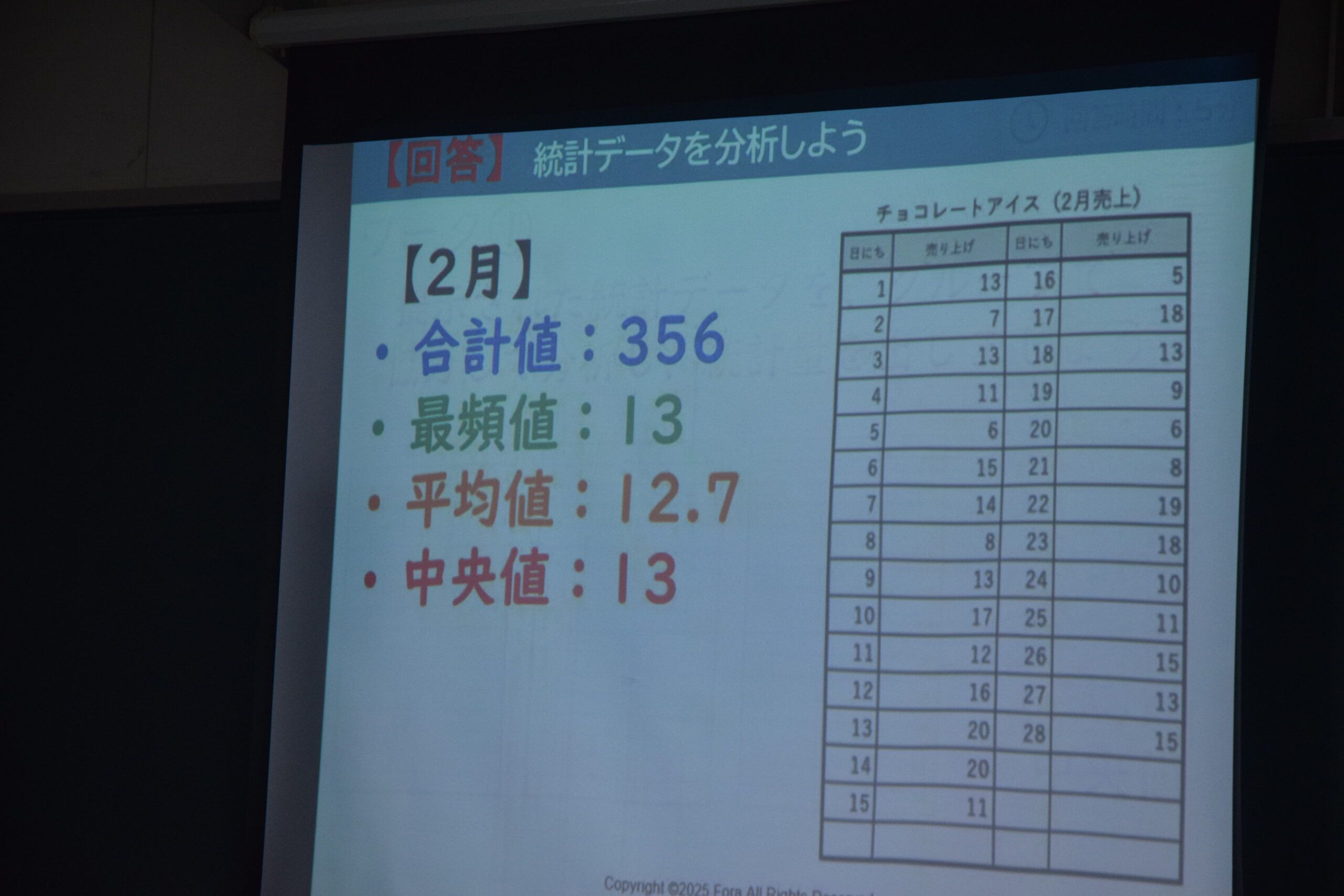生徒たちは、与えられた数値から自分なりの考えを導き出し提案する練習を行ったほか、不適切なグラフの例を修正・改善する活動にも挑戦。データの持つ多様な側面やリスクを理解し、情報を根拠として活用する力を高めました。
