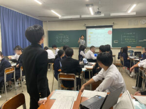 その上で、課題が解決された 理想の姿(ありたい姿) を言葉やイラストで表現しました。言語化の前にグループで交流しながら理想像を描くことで、価値観や目指す方向性を具体化し、課題設定の精度を高める第一歩となりました。最後には、生徒たちが自分の言葉で現状や理想の姿について発表し合い、「正解のないテーマに向き合いながら、探究の問いは「最初から完璧に作るものではなく、育てていくもの」であることを実感する姿が見られました。